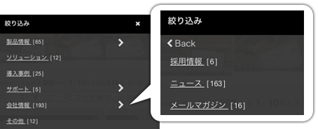 ポータルサイト、ショッピングサイト等でよく見かける、階層形式でのカテゴリ絞り込み機能です。膨大な検索結果から必要な情報を絞り込む際に便利です。